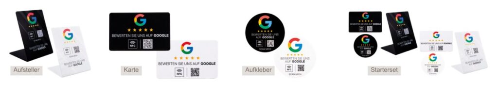 Möchten Sie schnell und unkompliziert mehr positive Google Bewertungen für Ihr Unternehmen generieren? Mit unseren Google Bewertungs Booster Produkten geht das ganz einfach. Aufsteller, Karten und Aufkleber sind mit einem NFC-Chip und QR-Code ausgestattet, der Ihre Kunden direkt zu Ihrer Google-Bewertungsseite führt. Kein lästiges Suchen mehr – Ihre Kunden können mit einem einfachen Scan oder Tap eine Bewertung hinterlassen.